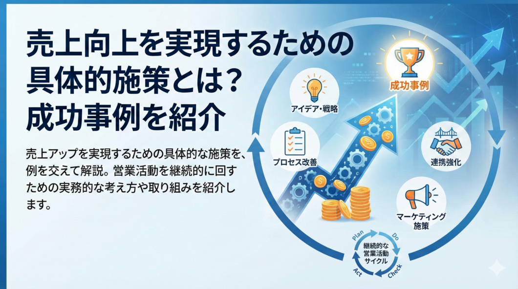 営業のツボ売上向上を実現するための具体的施策とは?成功事例を紹介売上アップを実現するための具体的な施策を、例を交えて解説。営業活動を継続的に回すための実務的な考え方や取り組みを紹介します。