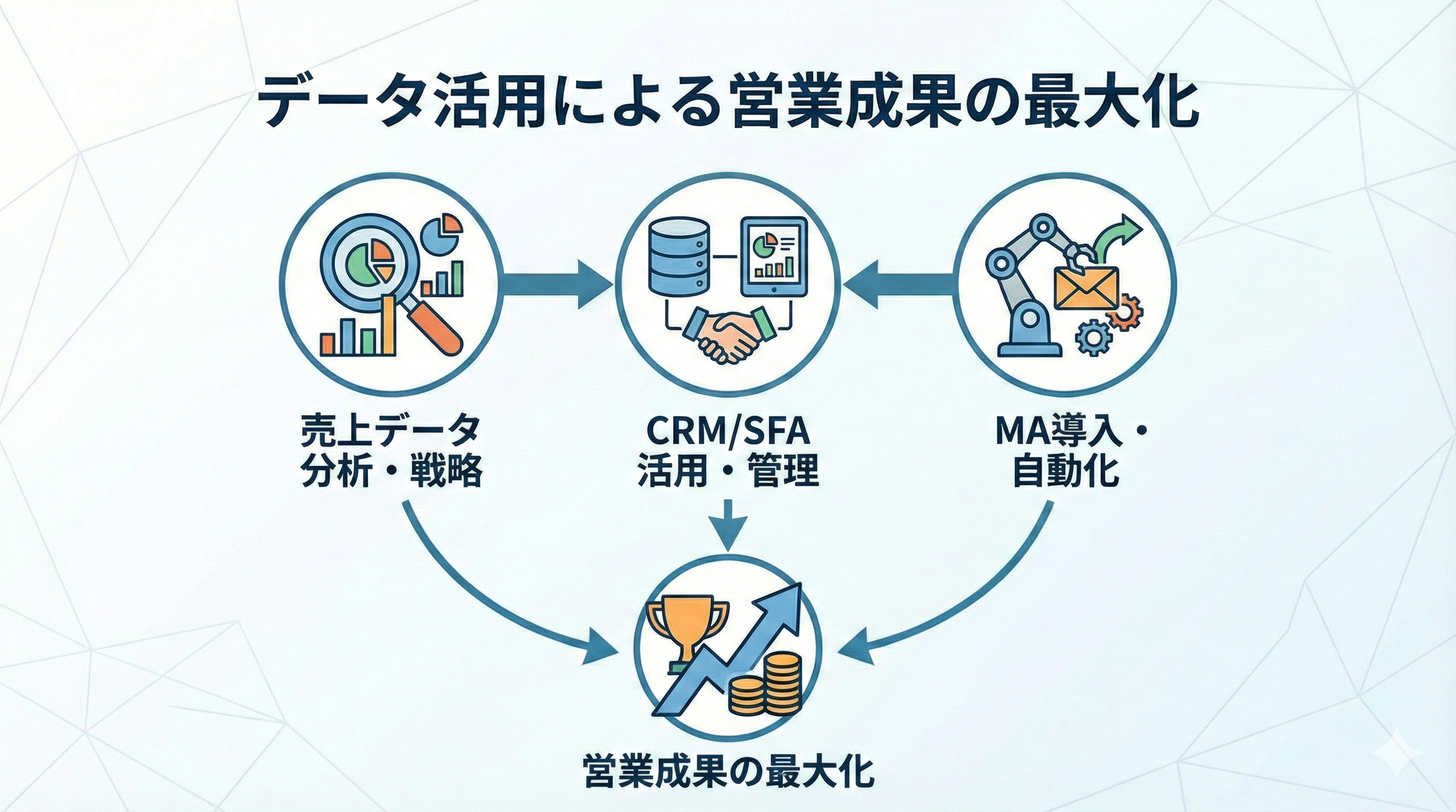 また、すべてのデータを完璧に分析しようとするのではなく、まずは売上向上に直結する指標から取り組むことが現実的です。データに基づいて判断し、施策を実行し、結果を検証するというサイクルを回し続けることで、営業成果は着実に積み上がっていきます。データ活用は、売上向上を実現するための強力な基盤となるのです。