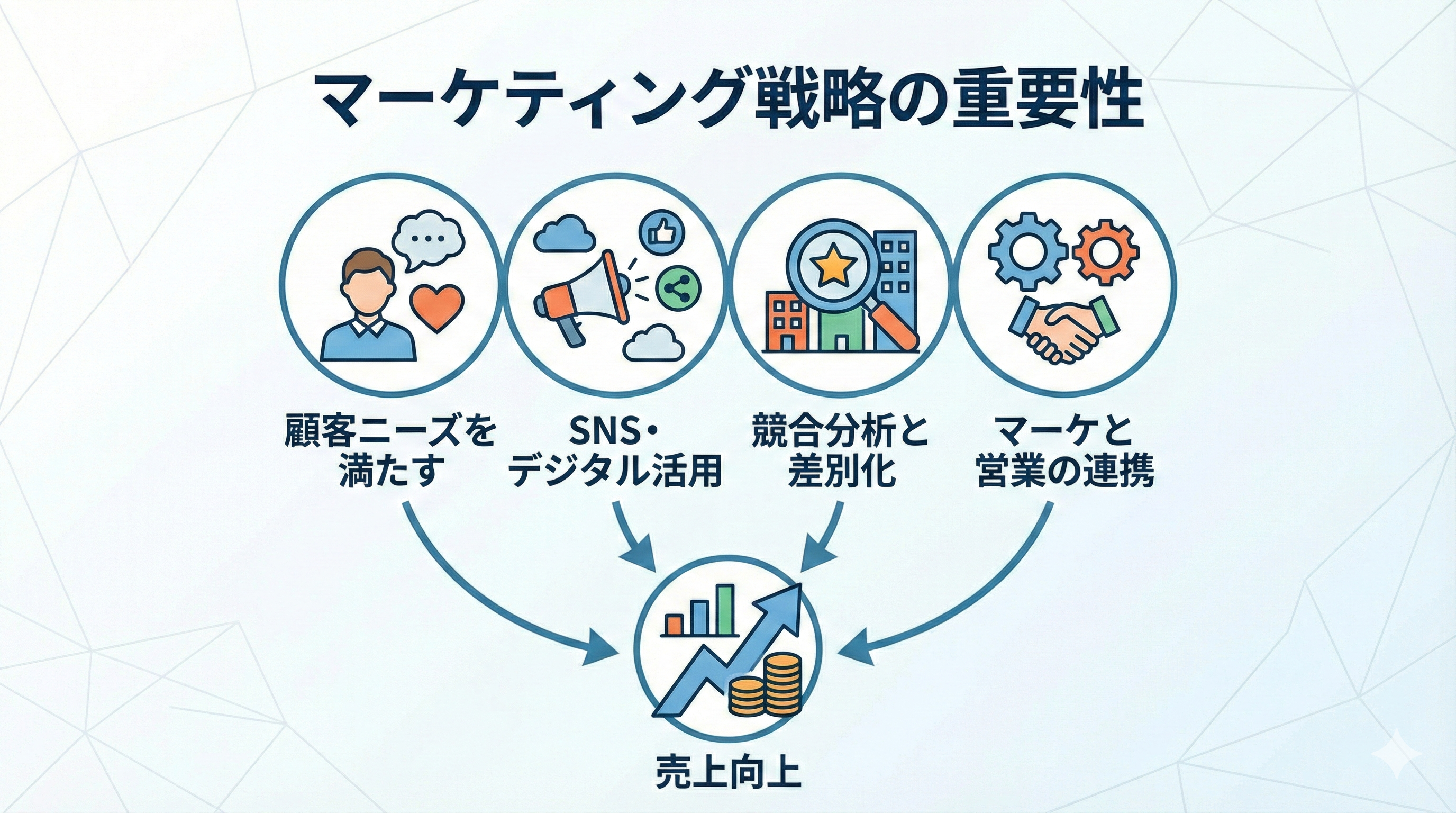 売上向上を安定的に実現するためには、マーケティング戦略の重要性を正しく理解し、計画的に実施していくことが欠かせません。マーケティングは単なる広告や集客施策ではなく、顧客のニーズを把握し、自社の商品やサービスの価値を適切に伝え、購入や成約につなげるための全体設計です。営業活動と連携したマーケティング戦略を構築することで、売上向上の成果は大きく変わります。