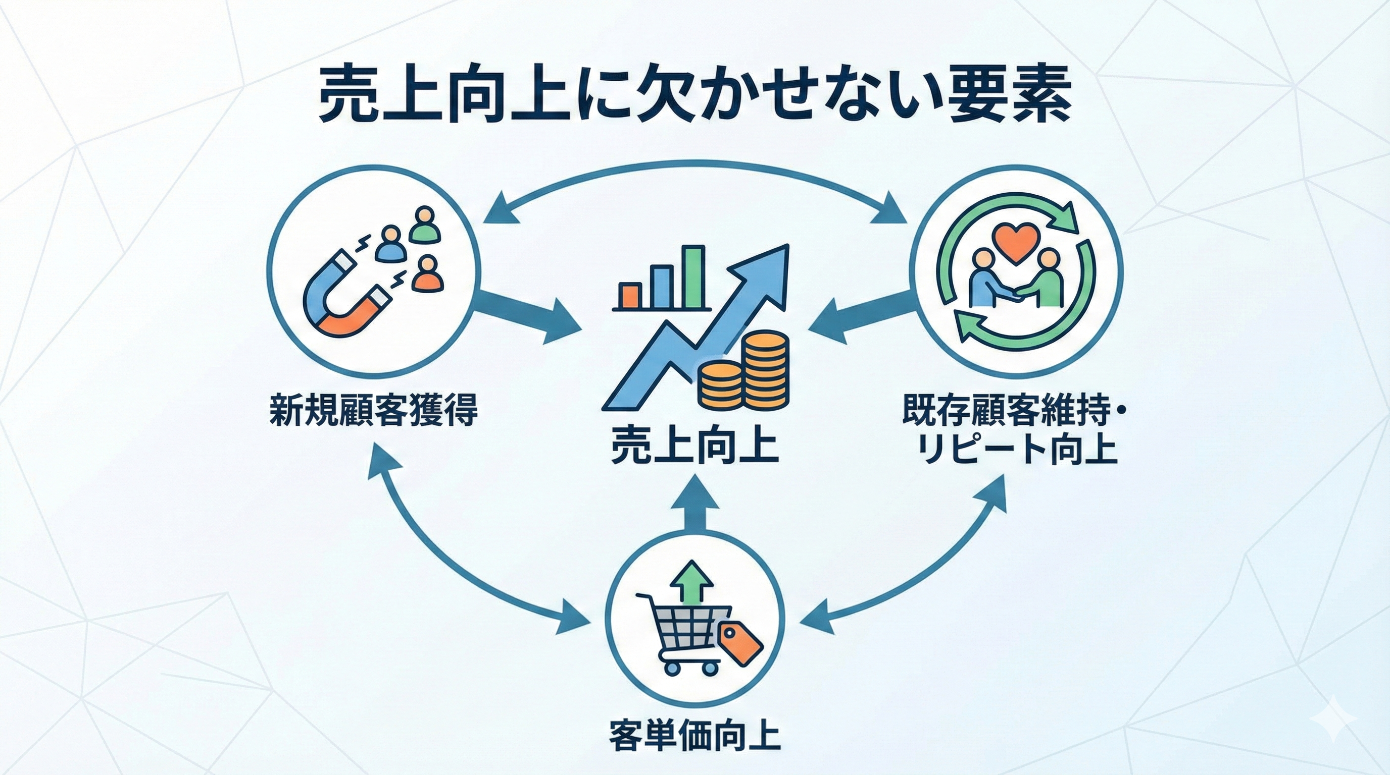 新規顧客の獲得、既存顧客のリピート促進、客単価の向上は、それぞれ単独で考えるものではありません。これらの要素を連携させ、全体として最適化することが、売上向上を実現するうえで重要です。たとえば、新規顧客を獲得した後のフォロー体制が整っていなければ、リピートにつながらず、売上は一時的なものになってしまいます。