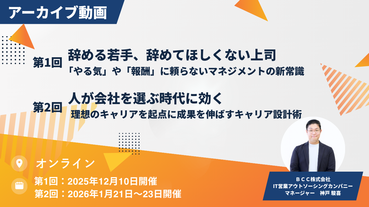 2025年12月に開催したオンラインセミナー、2026年1月に開催したオンデマンドセミナーのアーカイブ動画になります。営業現場でよく耳にするのが、「面談しても何も変わらない」「若手のやる気スイッチが分からない」という声。 本セミナーでは、人材マネジメントの本質を「人を辞めさせない」ことではなく、「今この瞬間、人が活きている状態をどうつくるか」に置き直し、 マネージャーやリーダーが現場で実践できる「人の核を見抜くマネジメント思考」をお伝えします。