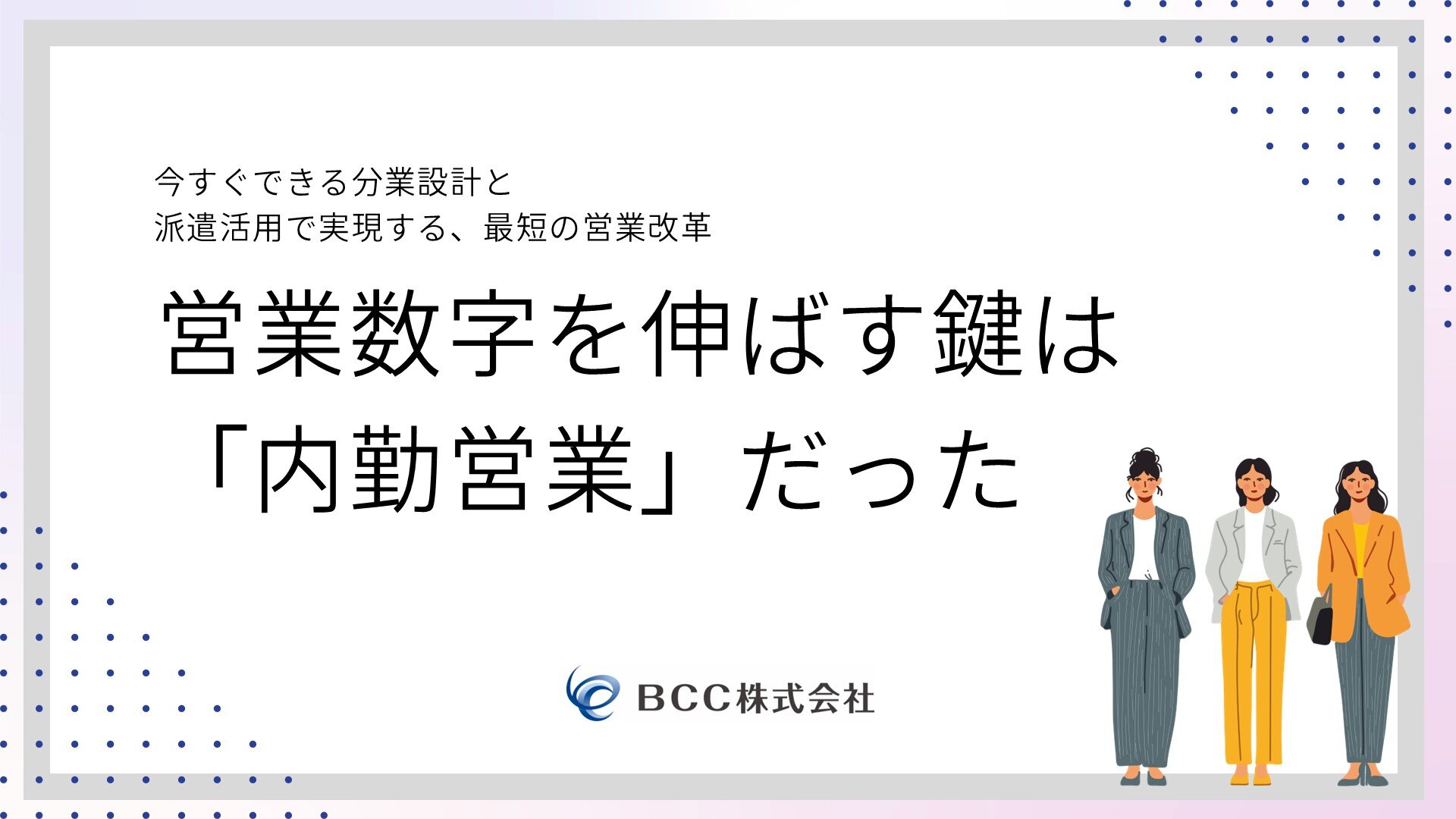 見積作成や請求対応、データ入力、資料作成など、 営業の時間を奪う“見えない業務負荷”の改善に必要なのが内勤営業投入による分業化。導入ステップや失敗例、IT営業に特化した内勤営業の活用事例もご紹介しています。