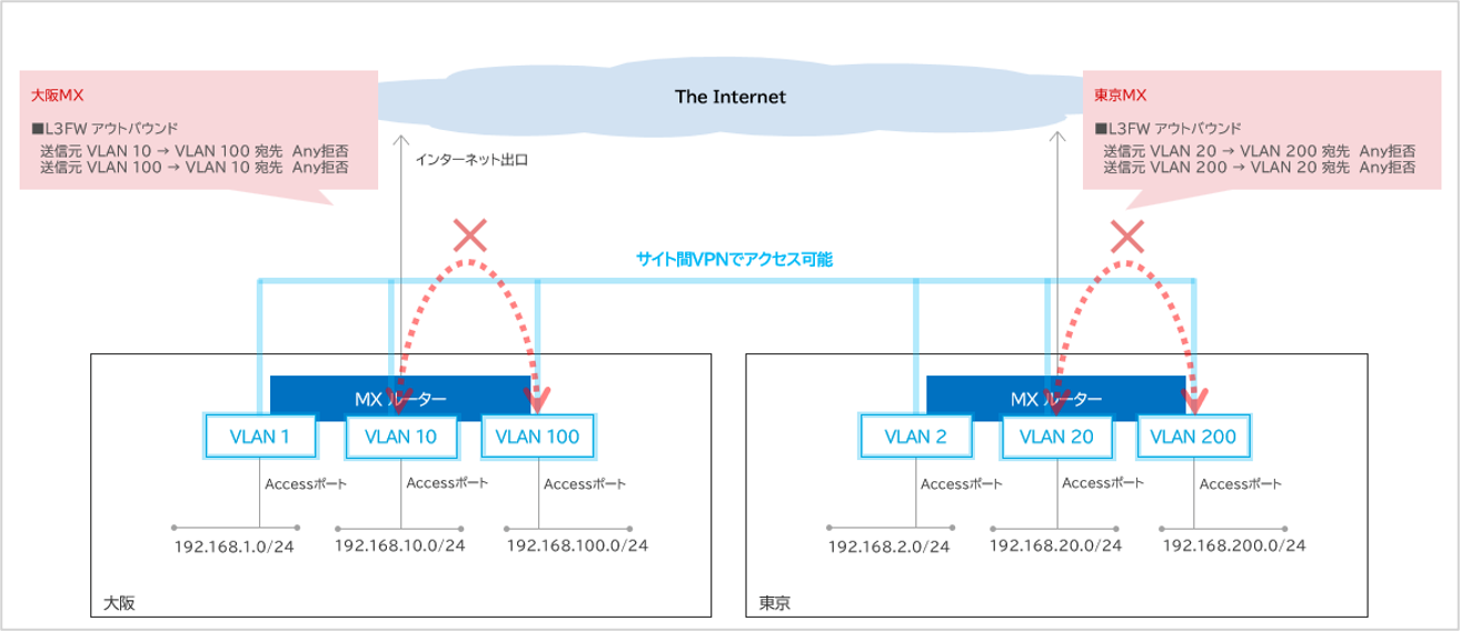 VPNモードを有効にした状態で、異なるMXのVLAN間アクセス制限を行います。