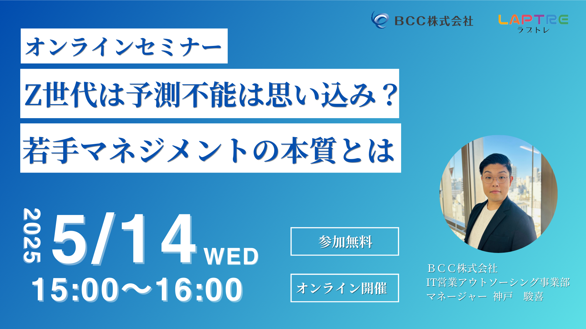 お知らせ【オンライン無料セミナー開催】Z世代は予測不能は思い込み?若手マネジメントの本質とは5月14日(水)「Z世代は予測不能は思い込み?若手マネジメントの本質とは」のオンラインセミナーを開催いたします! -