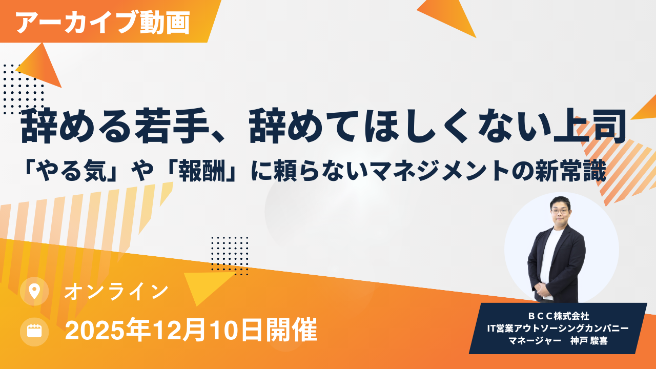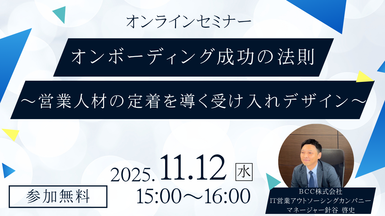 お知らせ【11/12オンラインセミナー開催】オンボーディング成功の法則~営業人材の定着を導く受け入れデザイン ~この度、営業部門における人材定着と早期戦力化をテーマにしたオンラインセミナー「オンボーディング成功の法則 〜営業人材の定着を導く受け入れデザイン〜」を、2025年11月12日(水)に開催します。 -