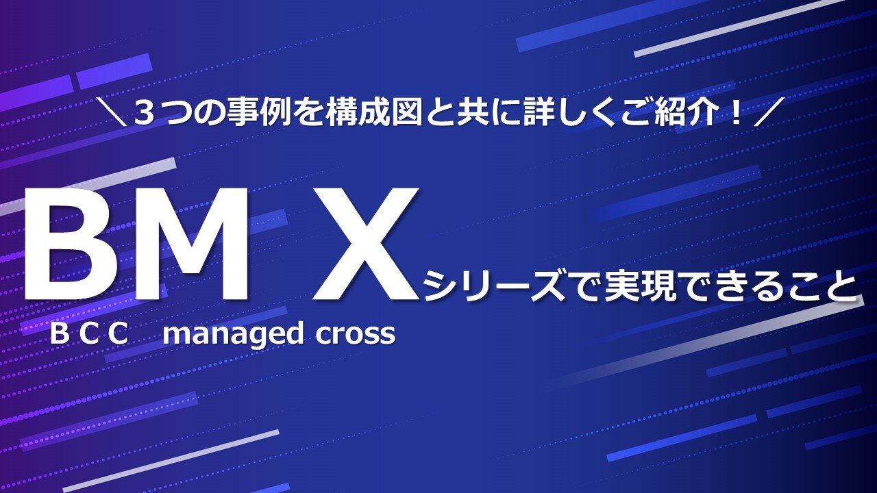 お知らせBM X(BCC managed cross)サービスショート動画公開のお知らせソリューションで提供しております、BM XサービスTypeMシリーズのショート動画を公開しました。 -