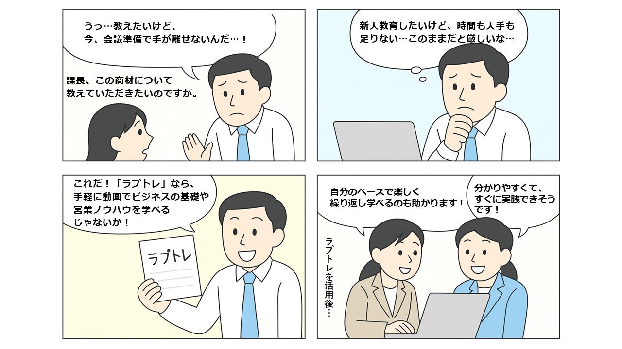 お知らせIT営業育成に特化したeラーニングサービス「ラプトレ」公開のお知らせIT営業育成に特化したeラーニングサービス「ラプトレ」を公開しました。 -
