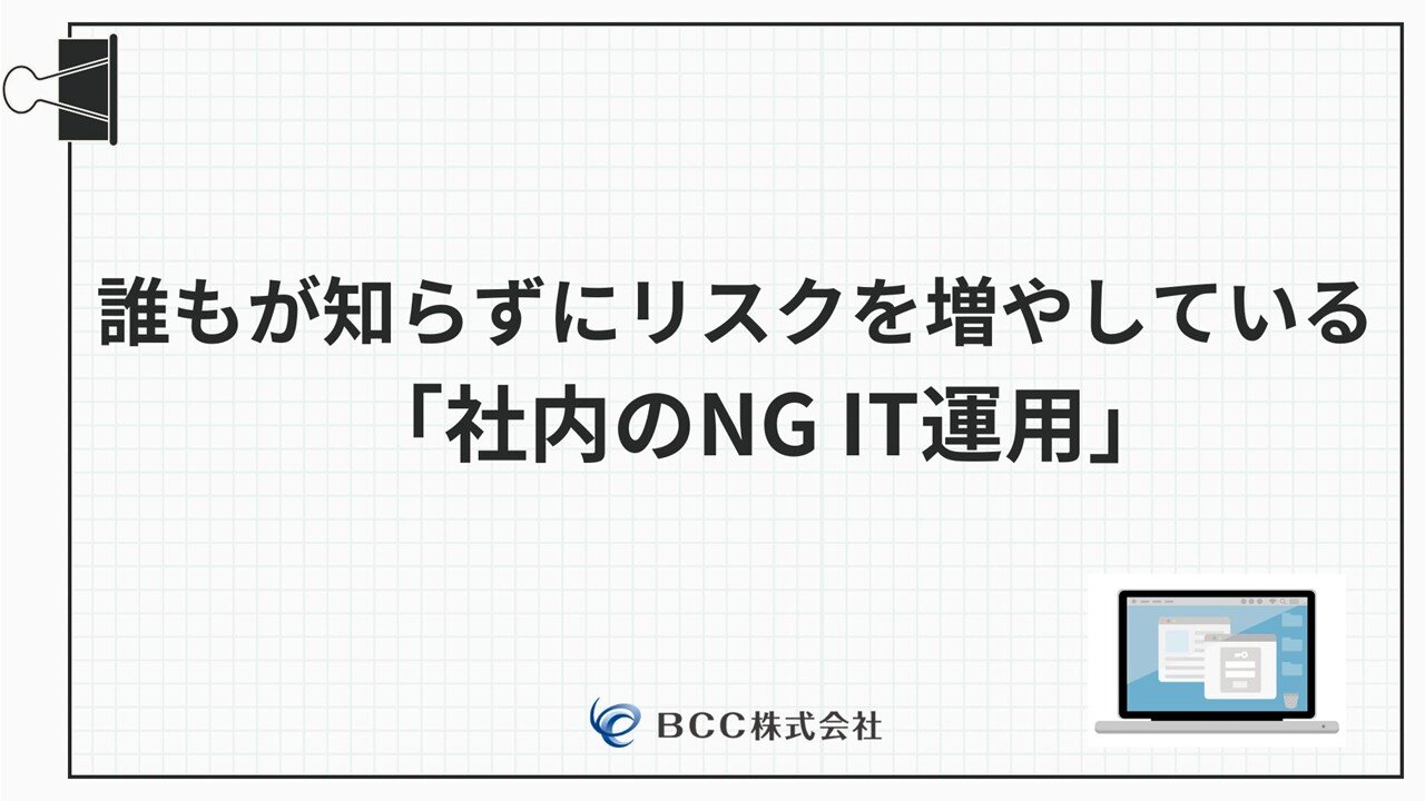 お知らせお役立ち資料公開のお知らせホワイトペーパー「誰もが知らずにリスクを増やしている社内のNG IT運用」を公開しましたので、お知らせいたします。