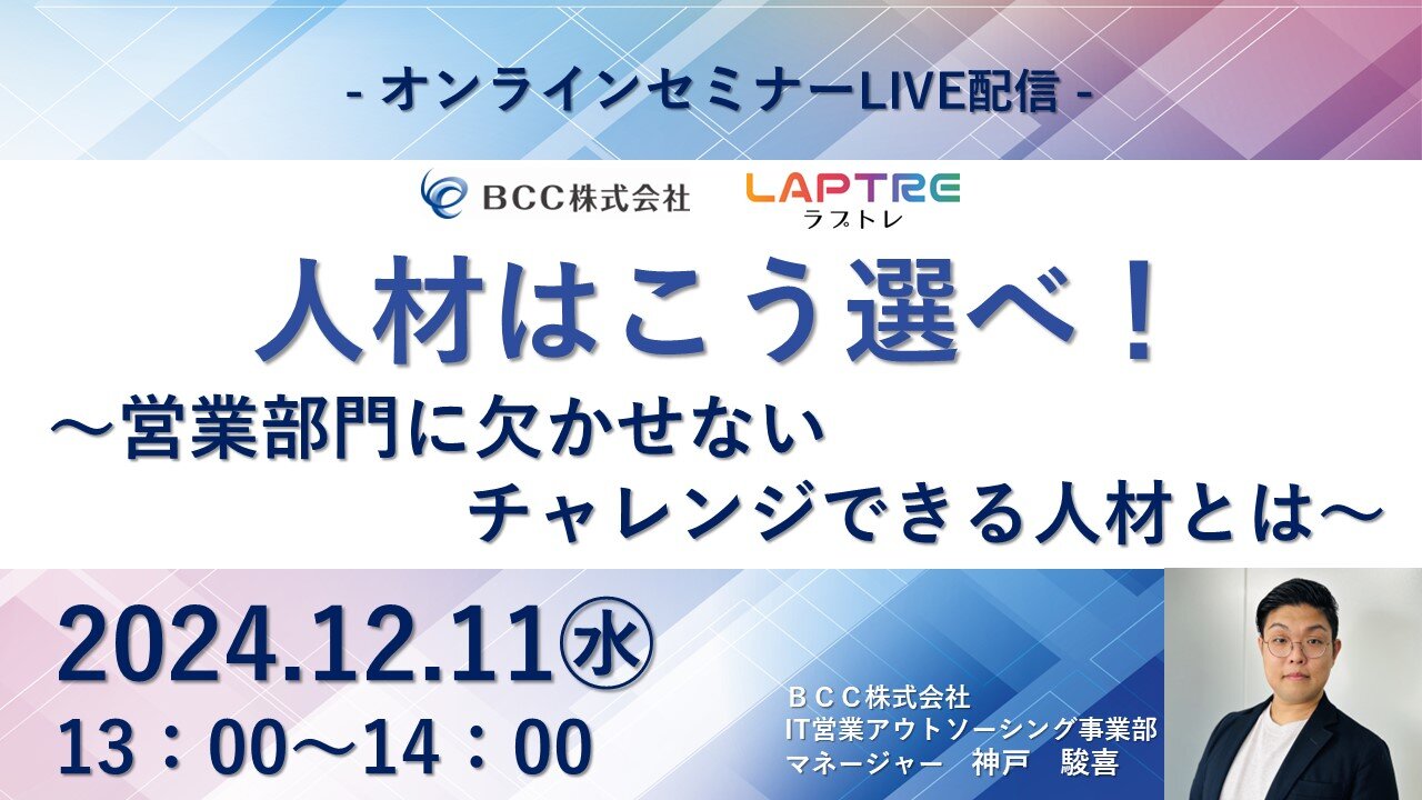 お知らせ【オンライン無料セミナー開催】人材はこう選べ!~営業部門に欠かせないチャレンジできる人材とは~12月11日(水)「人材はこう選べ!~営業部門に欠かせないチャレンジできる人材とは~」のオンラインセミナーを開催いたします! -