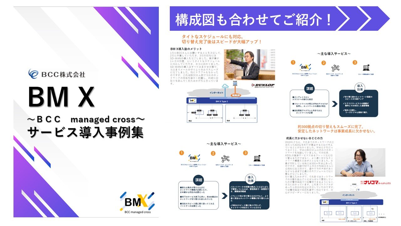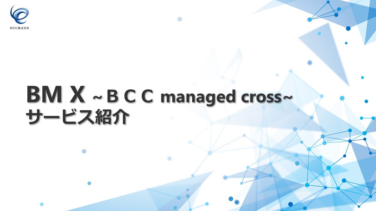 お知らせ新サービス『BM X ~ BCC managed cross ~』についてプレスリリースを配信いたしました。理想的なネットワークをマネージドで実現する新サービス「BCC managed cross」提供開始のお知らせ。 -