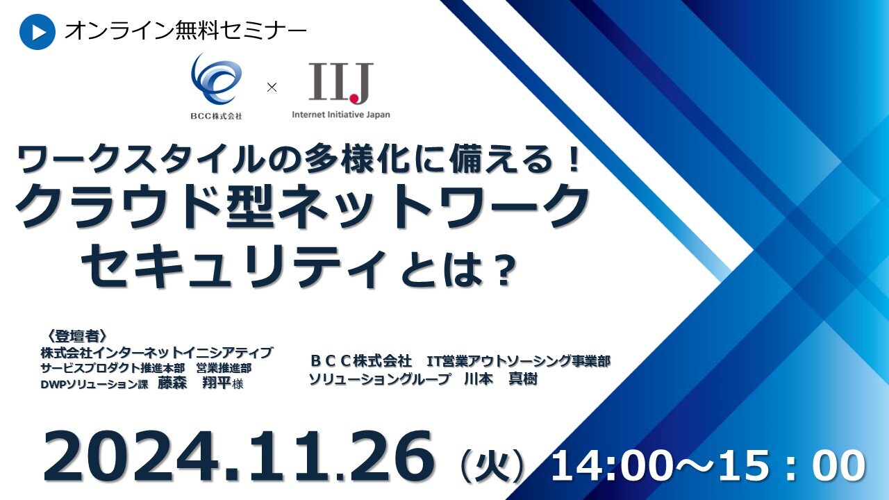 お知らせ【アーカイブ動画】ワークスタイルの多様化に備える!クラウド型ネットワークセキュリティとは2024年11月26日に当社主催で開催いたしました、オンラインセミナーのアーカイブ動画を公開いたしました。 -